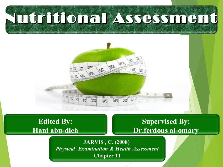 Nutritional assessment includes a normative evaluation of dietary intake and nutritional status indicators in order to estimate for instance the proportion of the population at risk. Integrates relevant information on laboratory test results for hydration status nutrition-related anemia micronutrient deficiencies and other nutrition related disorders with previous learning experience and current practice models. The tests determine what the body is lacking and what the body has to work harder to get the necessary nutrients.